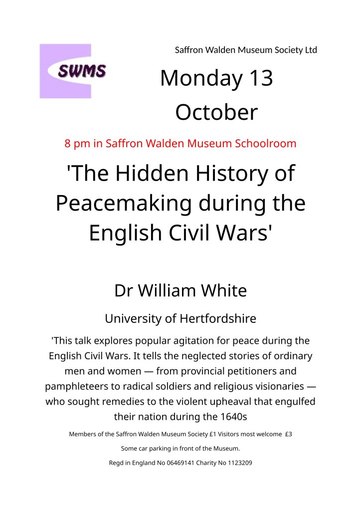 ‘This talk explores popular agitation for peace during the English Civil Wars. It tells the neglected stories of ordinary men and women — from provincial petitioners and pamphleteers to radical soldiers and religious visionaries — who sought remedies to the violent upheaval that engulfed their nation during the 1640s